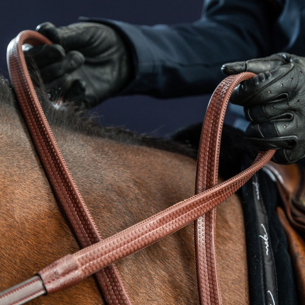 The Dy'on New English 5/8" Rubber Reins are premium-quality reins designed to complement the bridles and double bridles of Dy'on's New English Collection. Crafted from Grade 1 buffalo leather, these reins feature a raised, fancy-stitched front with tone-on-tone stitching, providing both durability and a refined appearance. The pimpled rubber grip ensures a secure hold, while the Dy'on stoppers offer added control. Stainless steel buckles complete the design, ensuring longevity and resistance to corrosion.