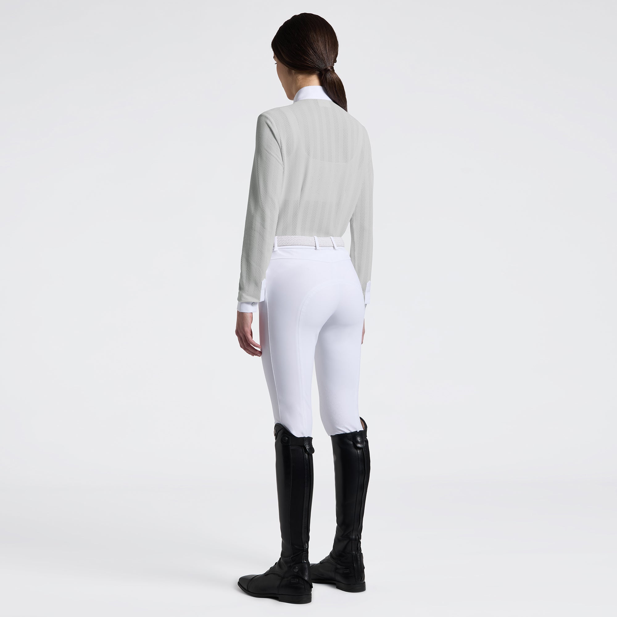 The Cavalleria Toscana Competition Shirt is an essential piece of equestrian sportswear. Made from technical jersey, it offers a close fit and maximum freedom of movement. The design is classic and elegant, featuring long sleeves and a Mandarin-style collar, enhanced by a refined pleated front panel. The closure is hidden and automatic for a clean, polished look. Perfect for the competition arena, it combines performance and style.