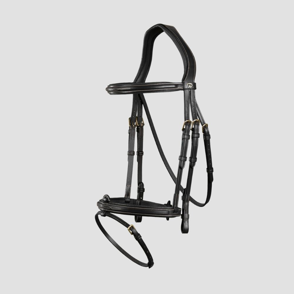 The bridle is part of the D collection, which means the colour of the stitching is cream and the buckles are brass. Available in brown and black.