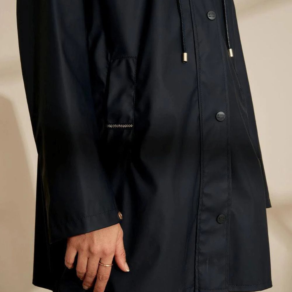 Raincoat combining elegance and practicality. Fitted cut, removable hood and waterproof fabric: perfect for facing rainy days.